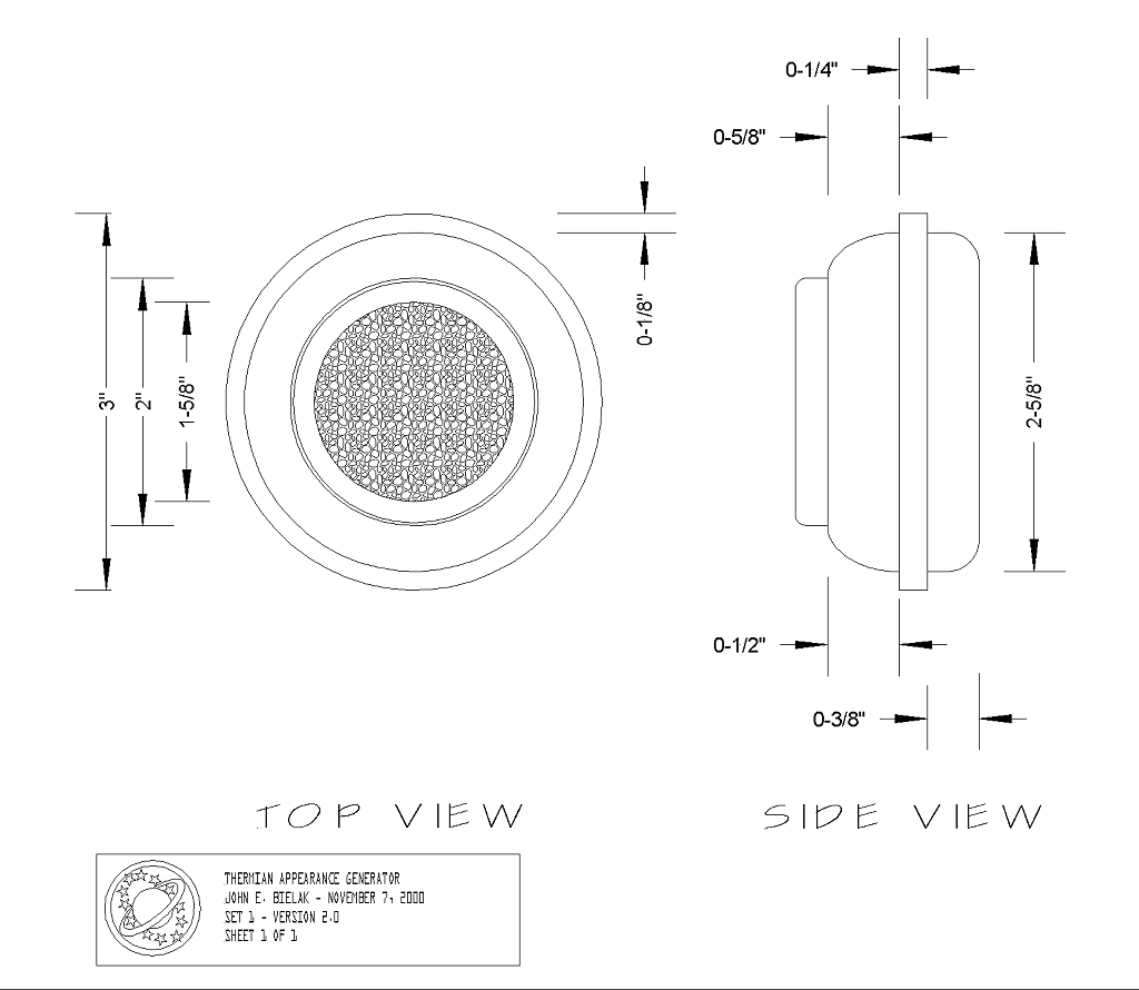 Special Thanks to K. J. Karvonen for Source Reference Material! The Thermian Appearance Generator blueprints are based on reference material and not the original prop specifications... the dimensions given are base on measurement of the material I had to work with and a number of educated guesses. Short of the release of a set of original prints, this is as accurate as we're about to get. |